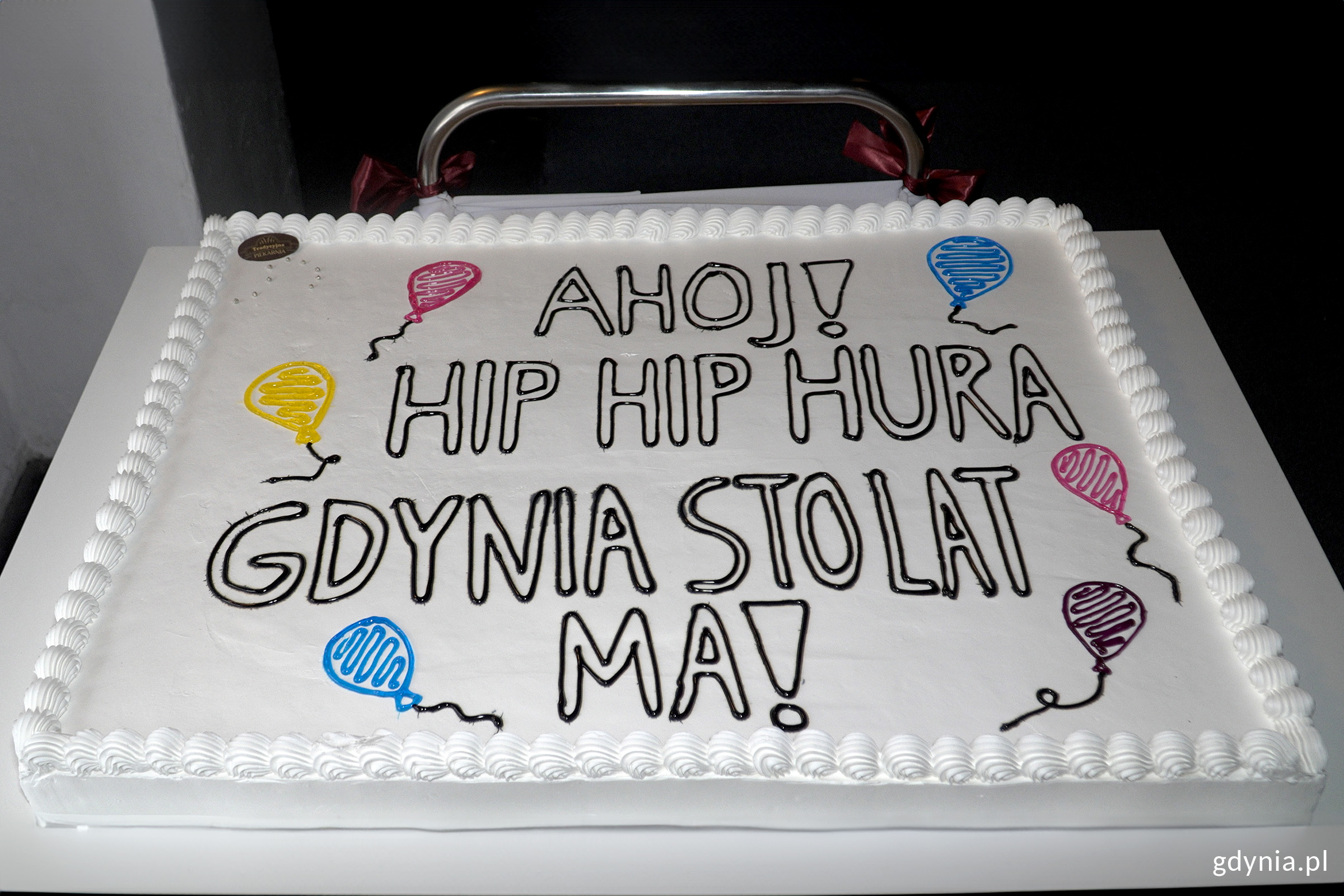 Ahoj, Gdynio! Przedszkolaki świętowały 100. urodziny miasta – niespodzianka, tort urodzinowy (fot. Przemysław Dopke)