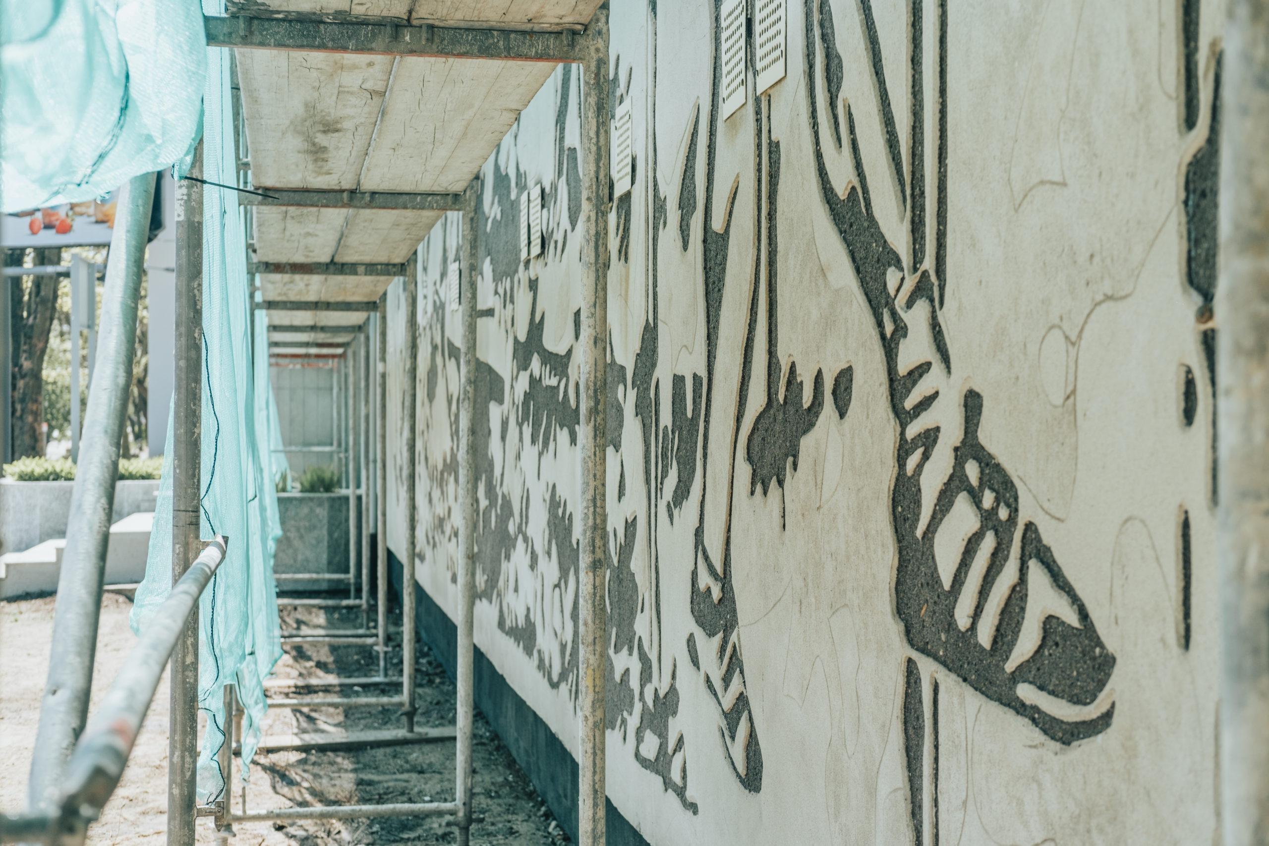 – Temat był dość oczywisty. Powstało kilka pierwotnych wersji w małej skali. Główną osią stała się żaglówka, naokoło której powstały postacie trenujące różne dyscypliny sportowe – wspomina projektant. Zdecydował się na technikę sgraffito. – To technika pracy polegająca na układaniu kolejnych warstw kolorowych tynków i zeskrobywaniu fragmentów warstw wierzchnich w czasie, kiedy jeszcze one nie zaschły. Takie dekoracje są niezwykle trwałe, mogą przetrwać nawet 200-300 lat. W Gdańsku możemy zobaczyć tego rodzaju ozdoby na kamienicach, jednak są to prace robione podczas powojennej odbudowy – wyjaśnia.