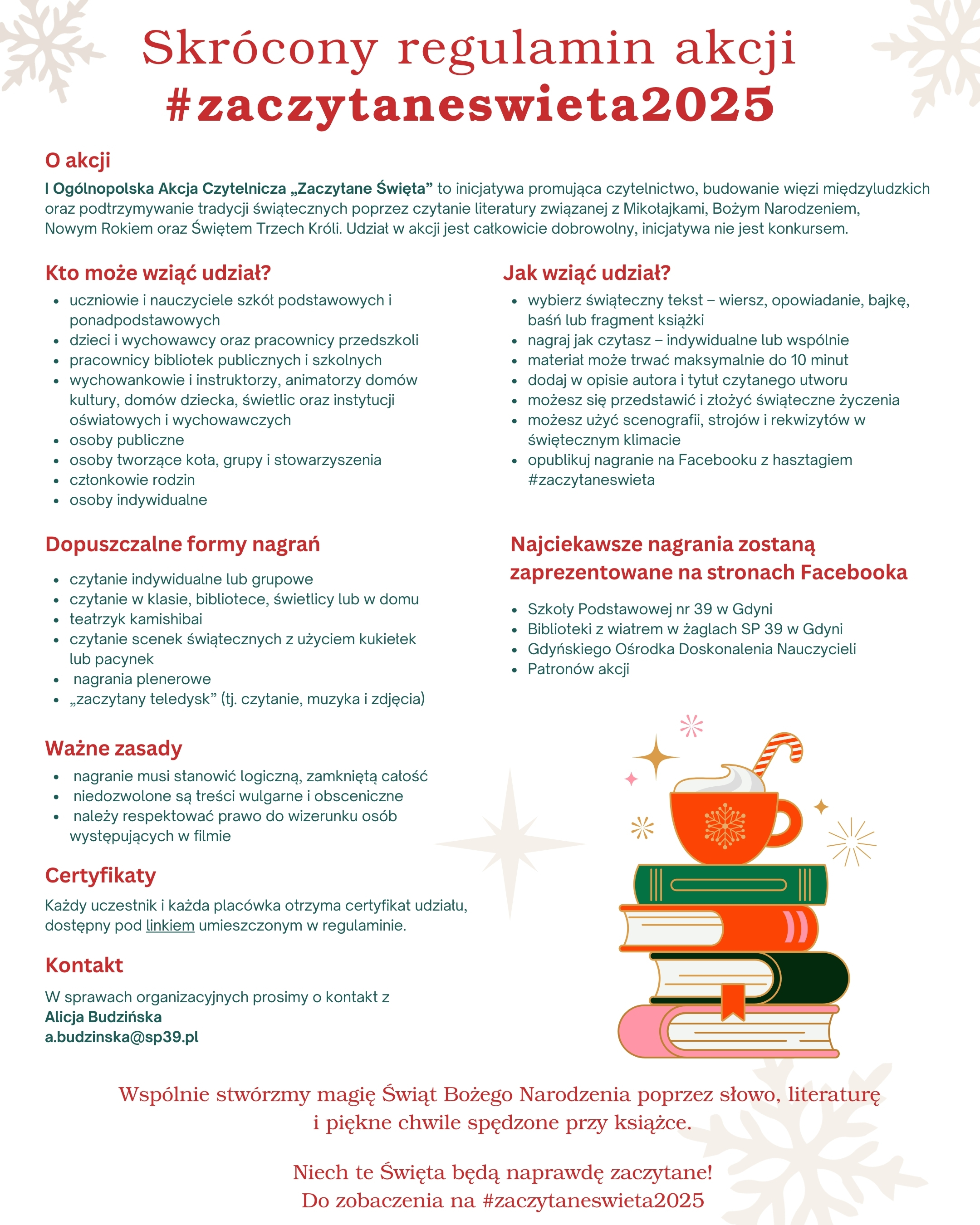 Filmy należy udostępnić z hashtagiem #zaczytaneswieta2025. Każdy uczestnik lub placówka może po tym pobrać certyfikat udziału tutaj. Regulamin konkursu dostępny jest pod tym linkiem.