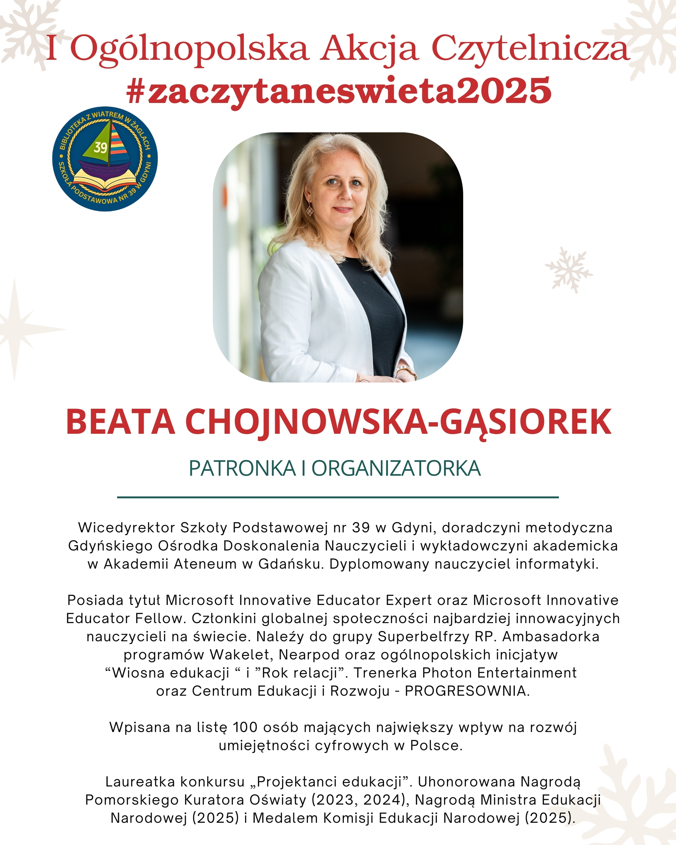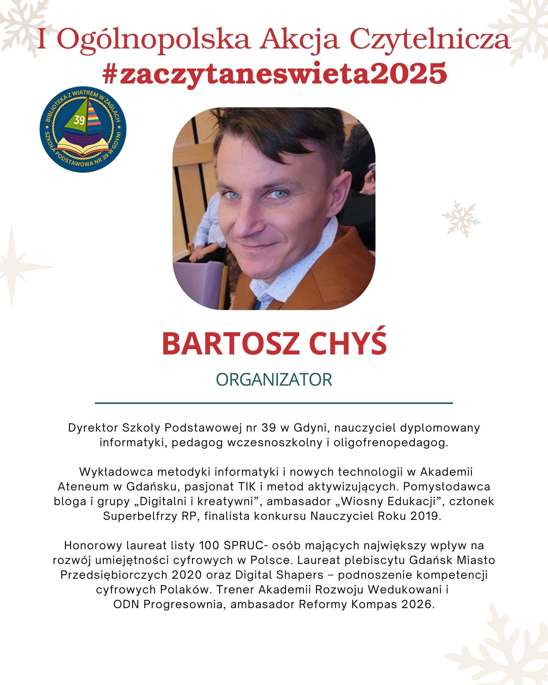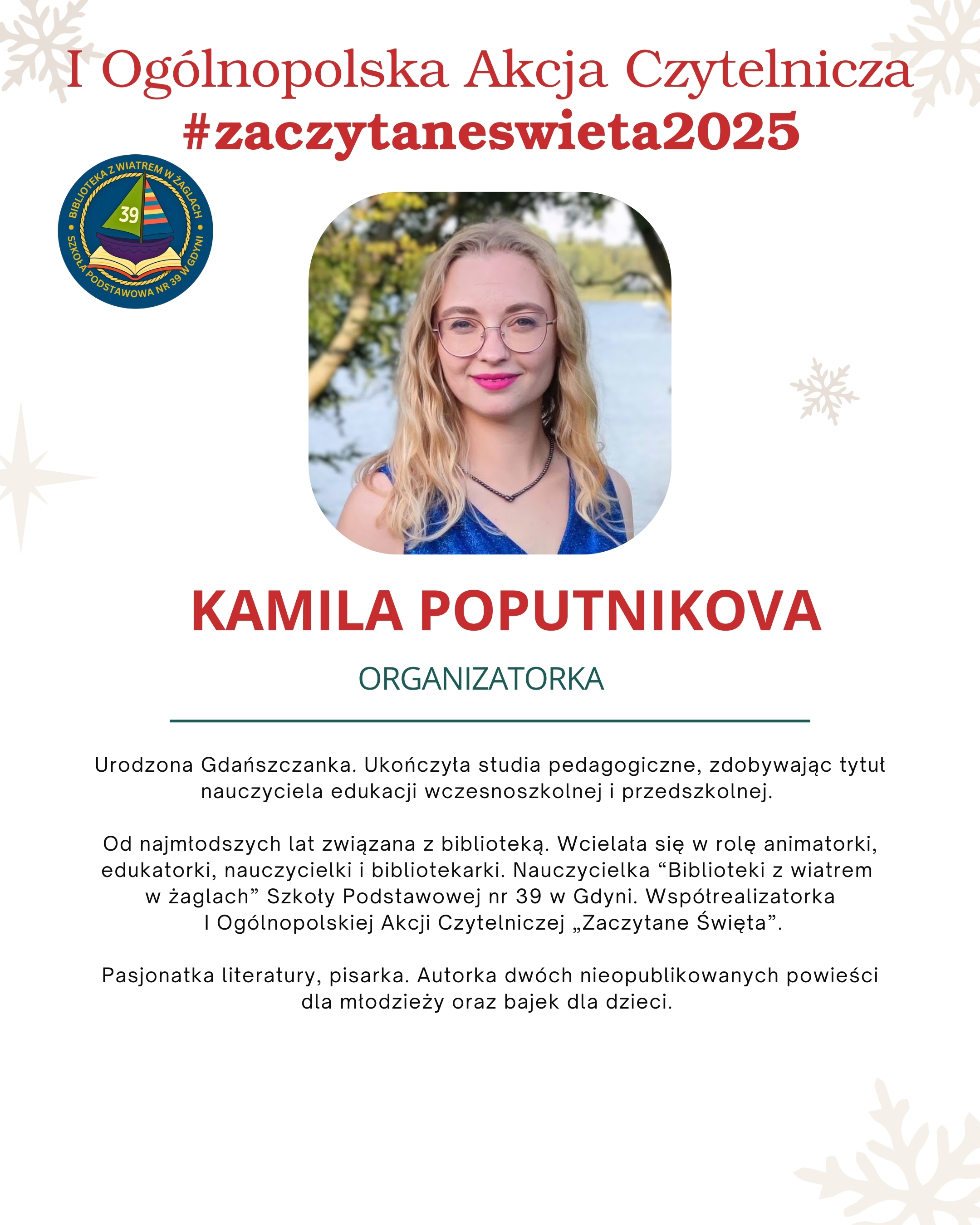 Organizatorami są dyrektor szkoły Bartosz Chyś, wicedyrektorka i patronka konkursu Beata Chojnowska-Gąsiorek oraz nauczycielki bibliotekarki Alicja Budzińska i Kamila Poputnikova.