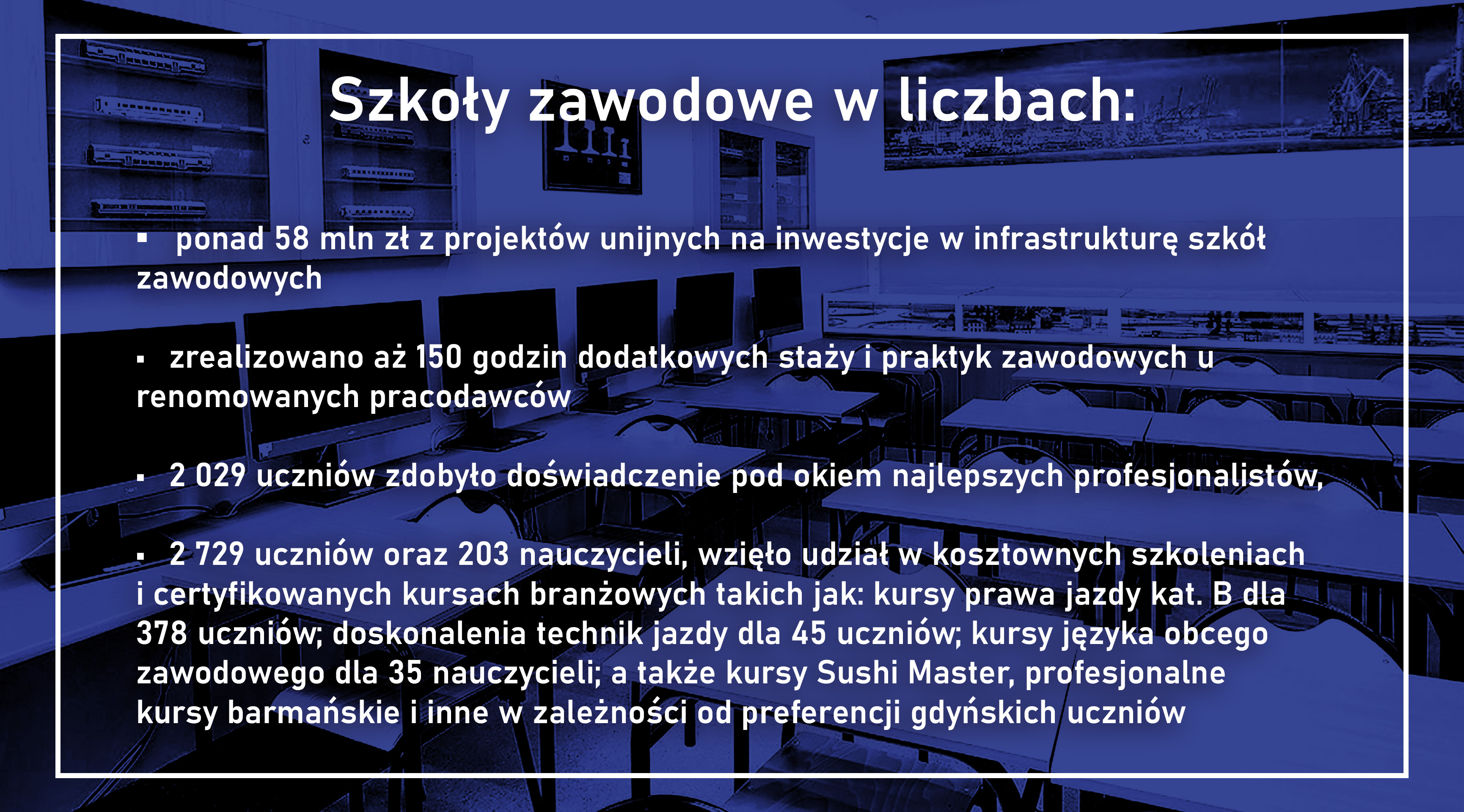 Z kolei 2 729 uczniów oraz 203 nauczycieli, wzięło udział w kosztownych szkoleniach i certyfikowanych kursach branżowych takich jak: kursy prawa jazdy kat. B dla 378 uczniów; doskonalenia technik jazdy dla 45 uczniów; kursy języka obcego zawodowego dla 35 nauczycieli; a także kursy Sushi Master, profesjonalne kursy barmańskie i inne w zależności od preferencji gdyńskich uczniów.